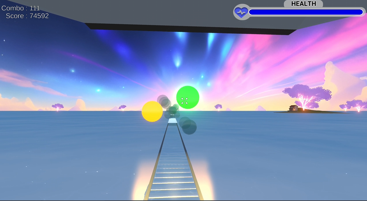 3D first-person rhythm game built in Unity. MIDI-driven note spawning, object pooling, AI difficulty scaling, and persistent player statistics.